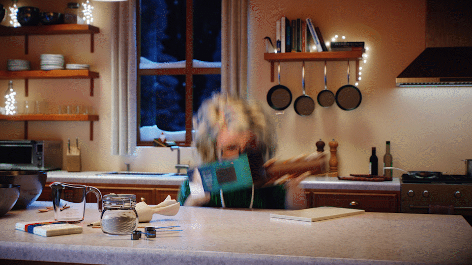 Guylaine's character, who claims to cook everything herself, hides the packaging by creating origami from Revelations product boxes.