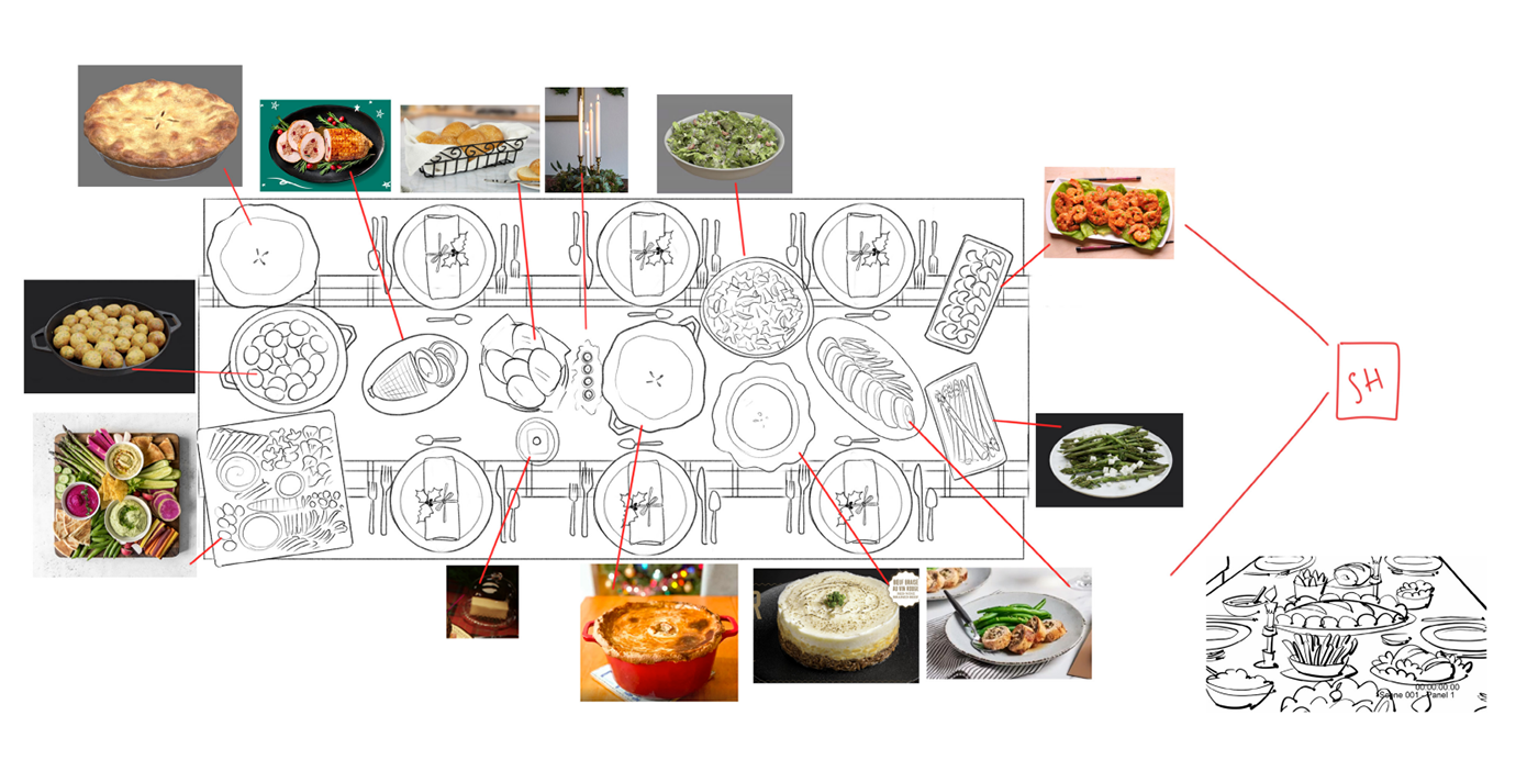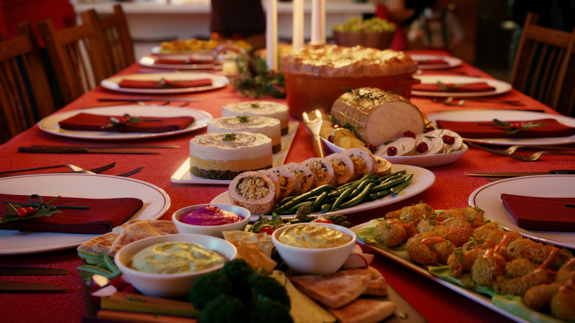 To craft a captivating Christmas gathering, no detail has been overlooked: a cozy ambiance, a generously laid dining table brimming with delectable dishes, abundant decorations, and most importantly, a diverse array of characters, all elegantly dressed for the occasion.
