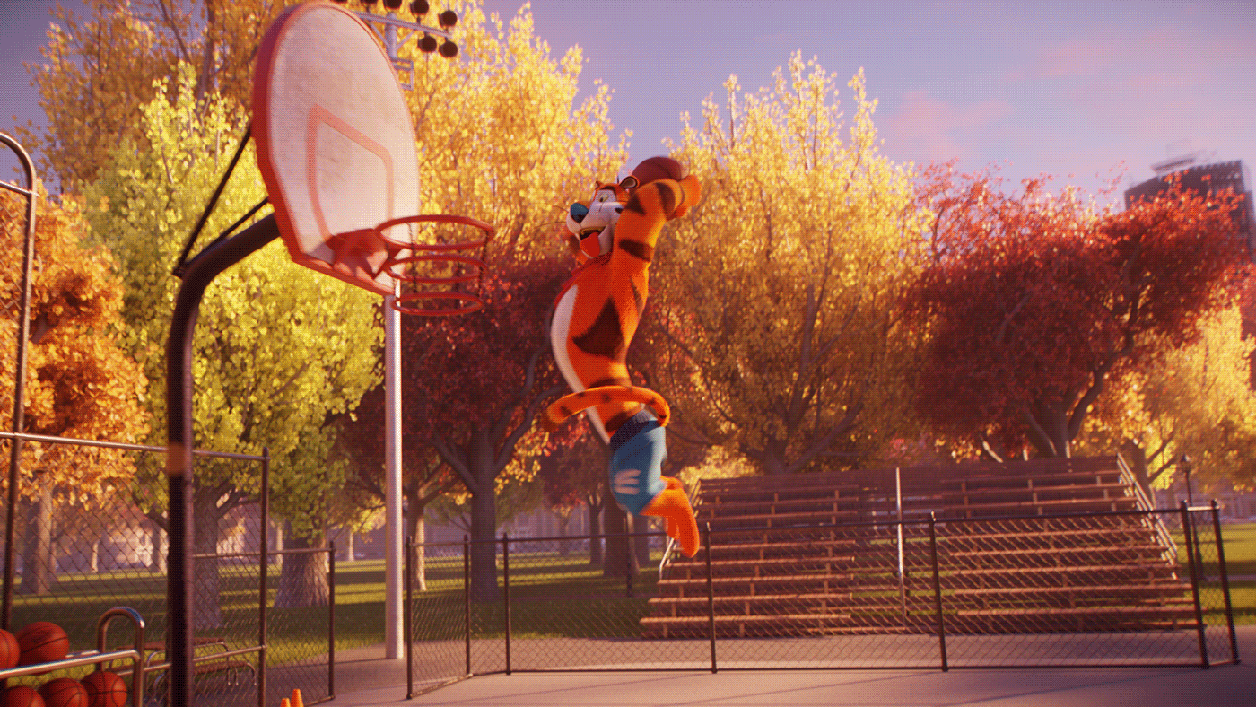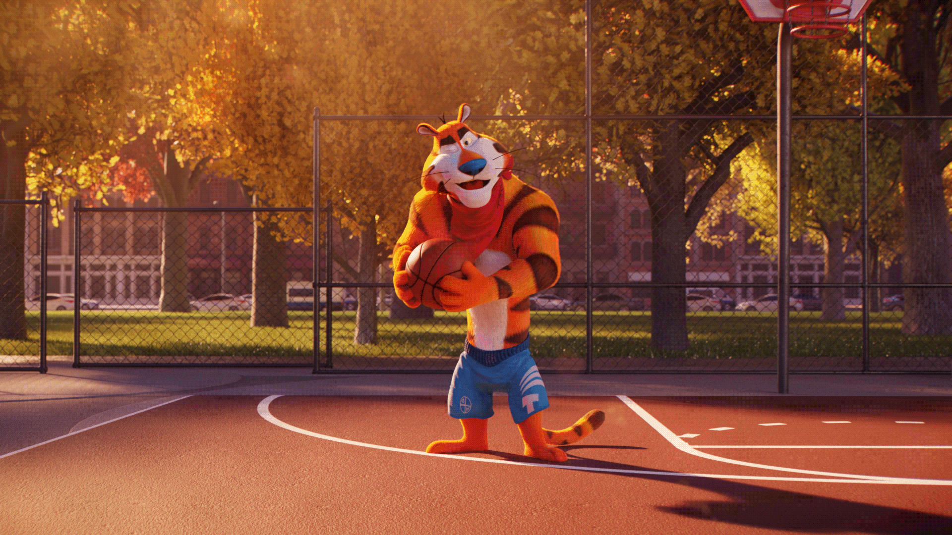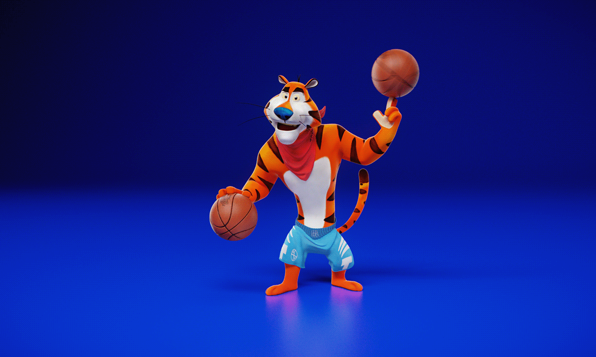 We love this Tony the tiger character. He's expressive and fun. A real treat for character animators! So, as part of an in-house project, we had fun creating a little scene of Tony having fun on a basketball court.